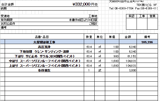 今回は、実際に行った屋根塗装工事の見積もり書をもとに、各工程ごとの費用や塗料の単価をわかりやすくまとめました。