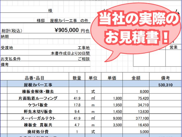 以下は、当社の屋根カバー工法の実際の見積もり例です。各項目をしっかり確認することが、適正価格で高品質な工事を行う第一歩となります。